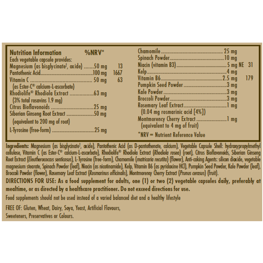 Ingredients: Magnesium (as bisglycinate†, oxide), Pantothenic Acid (as D-pantothenate, calcium), Vegetable Capsule Shell: hydroxypropylmethyl cellulose, Vitamin C (as Ester-C® calcium-L-ascorbate), Rhodiolife® Rhodiola Extract (Rhodiola rosea) (root), Citrus Bioflavonoids, Siberian Ginseng Root Exract (Eleutherococcus senticosus), L-Tyrosine (free-form), Chamomile (matricaria recutita) (flower), Anti-caking Agents: silicon dioxide, vegetable magnesium stearate, Spinach Powder (leaf), Niacin (as nicotinamide), Kelp, Vitamin B6 (as pyridoxine HCI), Pumpkin Seed Powder, Kale Powder (leaf), Broccoli Powder (flower), Rosemary Leaf Extract (Rosmarinus officinalis), Montmorency Cherry Extract (Prunus cerasus) (fruit).