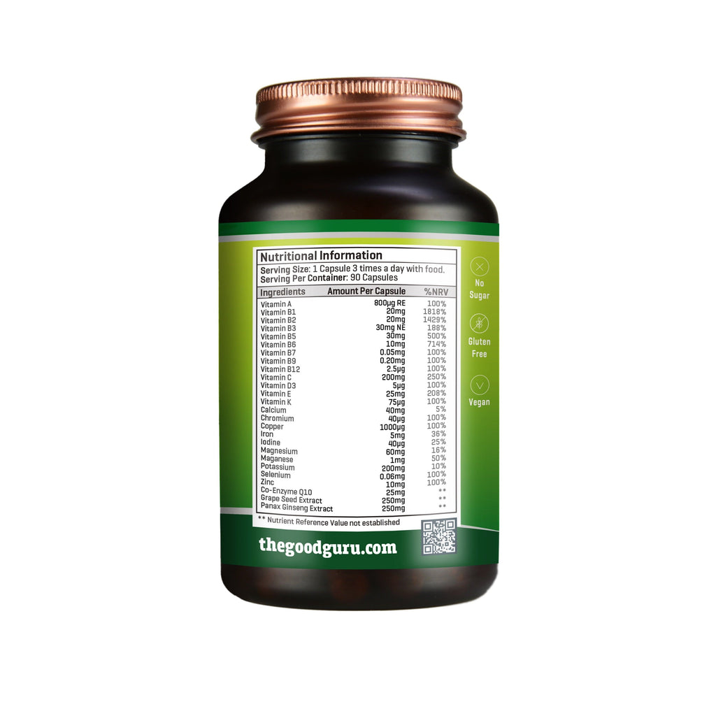800μg RE - Vitamin A 20mg - Vitamin B1 20mg - Vitamin B2 30mg NE - Vitamin B3 30mg - Vitamin B5 10mg - Vitamin B6 50μg - Biotin 200μg - Folic Acid 2.5μg - Vitamin B12 200mg - Vitamin C 5μg - Vitamin D3 25mg - Vitamin E 75μg - Vitamin K 40mg - Calcium 40μg - Chromium 1000μg - Copper 5mg - Iron 40μg - Iodine 60mg - Selenium 10mg - Zinc 25mg - Co-Enzyme Q10 12.5mg - Grape Seed Extract 50mg - Panax Ginseng Extract Vegetable Cellulose Capsule (HPMC).