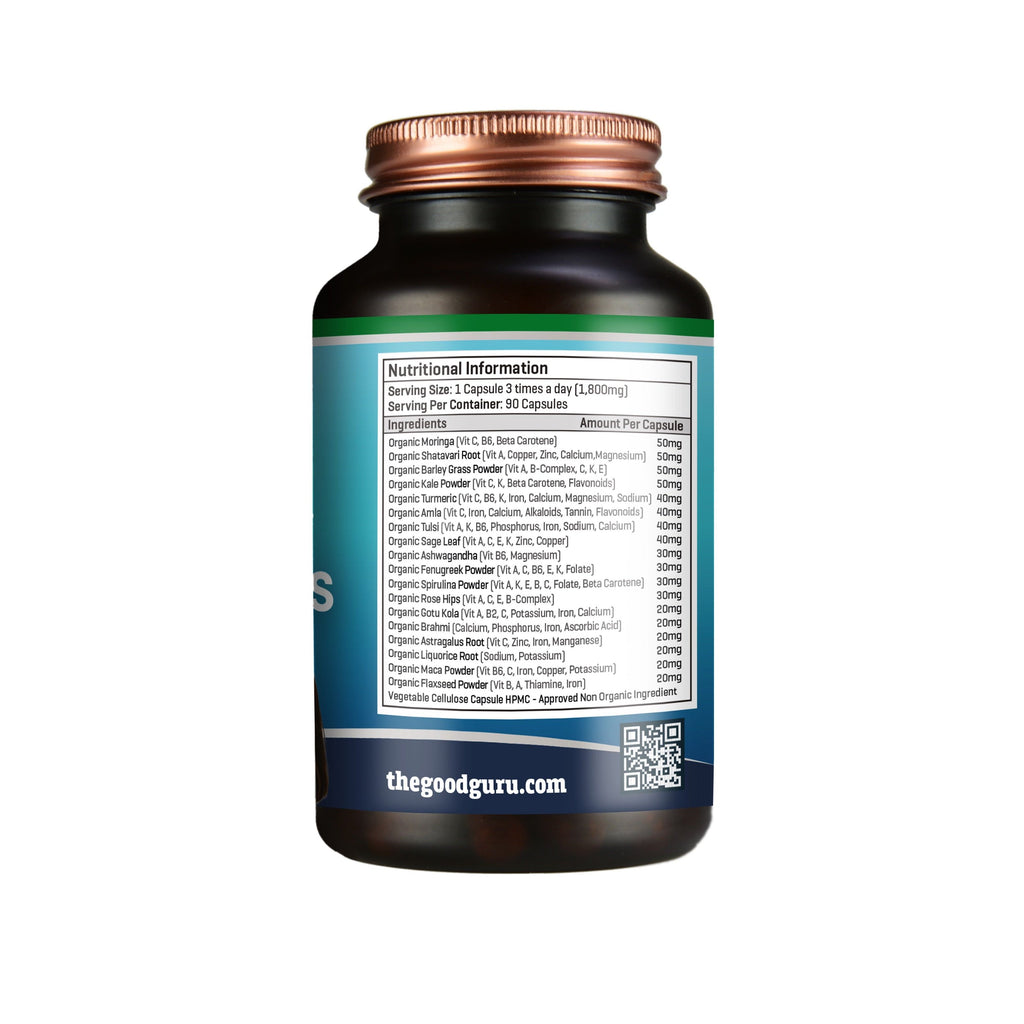 50mg - Organic Moringa Powder 50mg - Organic Shatavari Root Powder(Asparagus) 50mg - Organic Barley Grass Powder 50mg - Organic Kale Powder 40mg - Organic Turmeric Powder (Curcuma Longa) 40mg - Organic Amla Powder (Phyllanthus Emblica) 40mg - Organic Tulsi Powder (Holy Basil) 40mg - Organic Sage Leaf Powder 30mg - Organic Ashwagandha Powder (Withania Somnifera) 30mg - Organic Fenugreek Powder (Trigonella Foenum- Graecum) 30mg - Organic Spirulina Powder 30mg - Organic Rose Hips Powder 20mg - Organic Gotu Kola Powder(Centella Asiatica) 20mg - Organic Brahmi Powder (Bacopa Monnieri) 20mg - Organic Astragalus Root Powder 20mg - Organic Maca Powder 20mg - Organic Flaxseed Powder 20mg - Organic Liquorice Root Powder Vegetable Cellulose Capsule (HPMC)